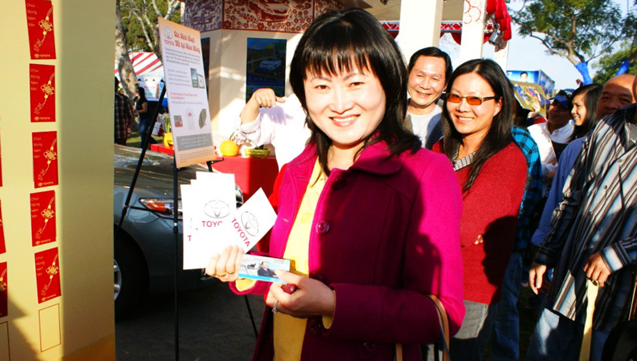 Toyota's presence at community events has been a staple throughout the years. One of the largest scale community events is the celebration of Chinese New Year. Toyota's booth is designed to match each year's Chinese zodiac. Besides the Asian American Expo, TET Festival in the Vietnamese community is an outstandingly popular event that Toyota participates in as a major sponsor. Engaging and interactive booth activities that provide extensive product education, car display with on location car specialists, and fun yet functional giveaways at the fascinating and visually impressive Toyota booth has been the spot light at every single event.